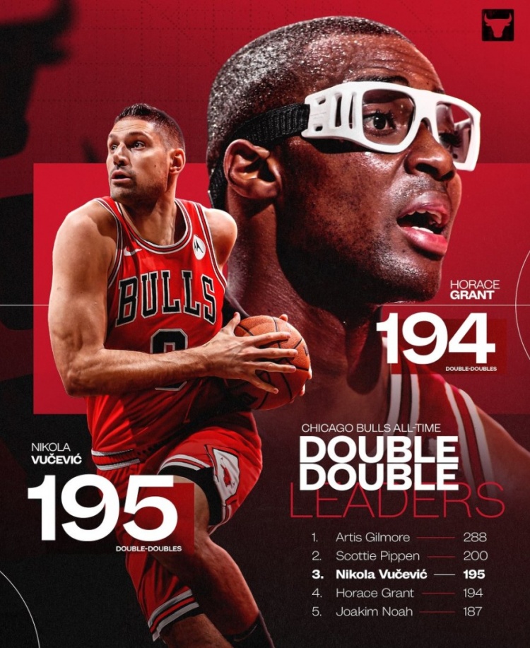 2025-03-11 15:03:39武切維奇公牛兩雙數超越”眼鏡蛇“格蘭特 上升至隊史第三位