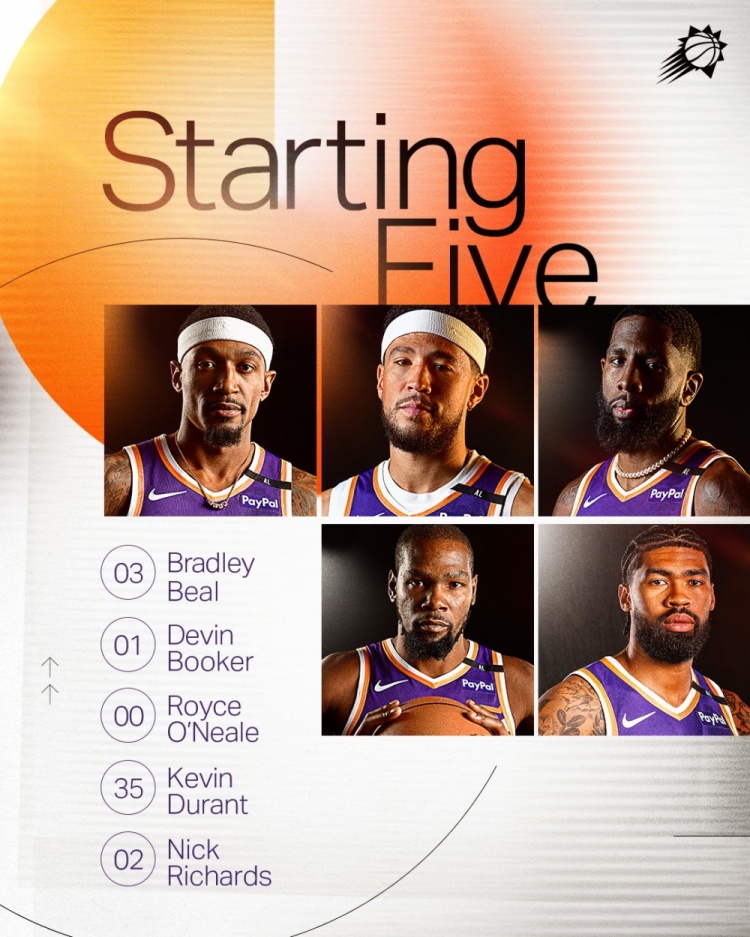 2025-02-24 15:12:56今日對陣猛龍!太陽首發:比爾、KD、布克、R-奧尼爾、理查茲