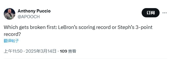 對此,記者Anthony Puccio發(fā)推問道:“詹姆斯的得分紀(jì)錄和庫里的三分紀(jì)錄,哪個會先被打破?”