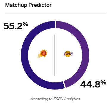 2025-03-16 21:45:58老詹缺陣&77大概率打!ESPN預(yù)測(cè)湖vs日勝率:湖人44.8% 太陽(yáng)55.2%