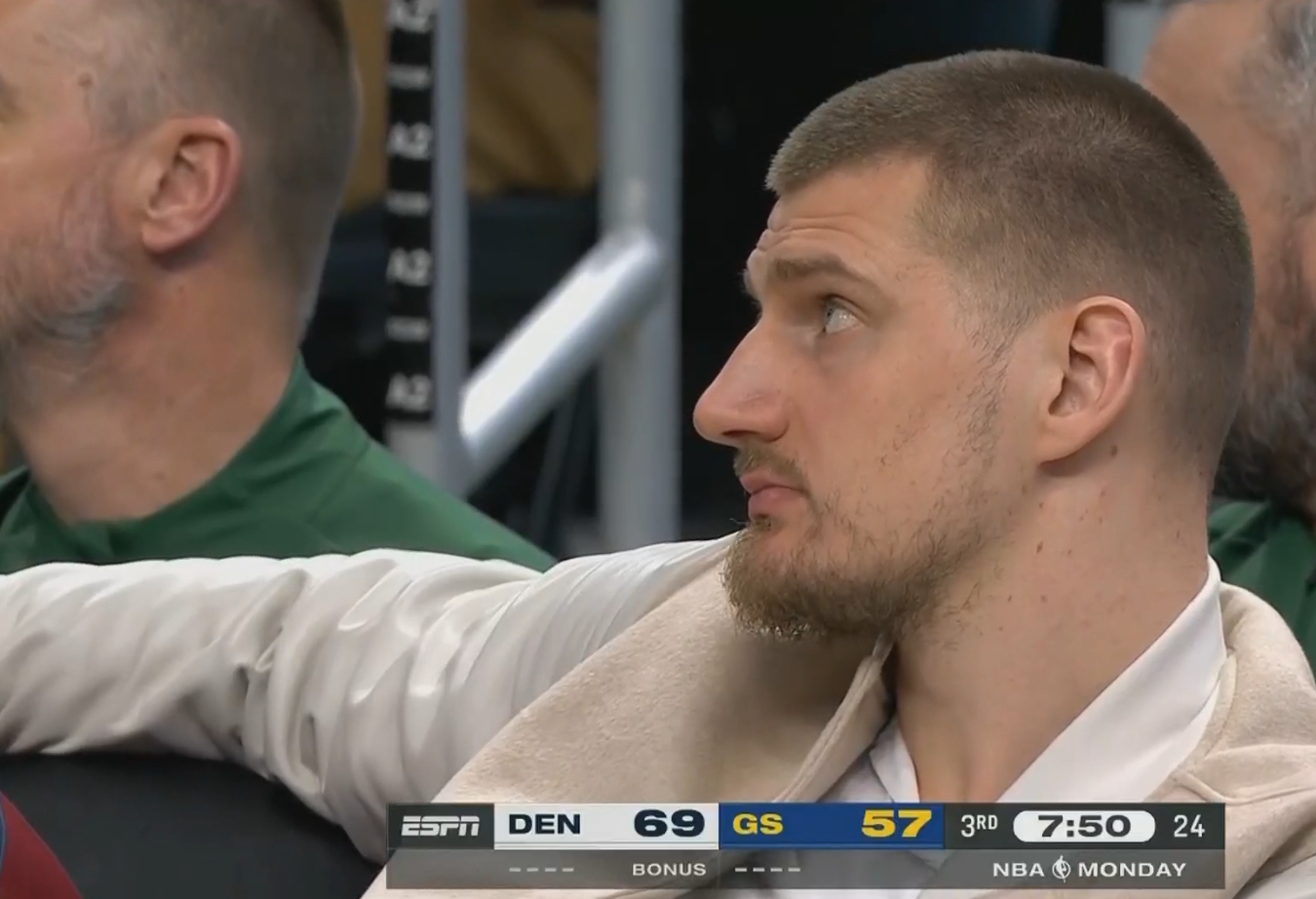 2025-03-18 14:20:32舒服~殘陣掘金領先勇士兩位數 場下的約基奇一臉淡定~