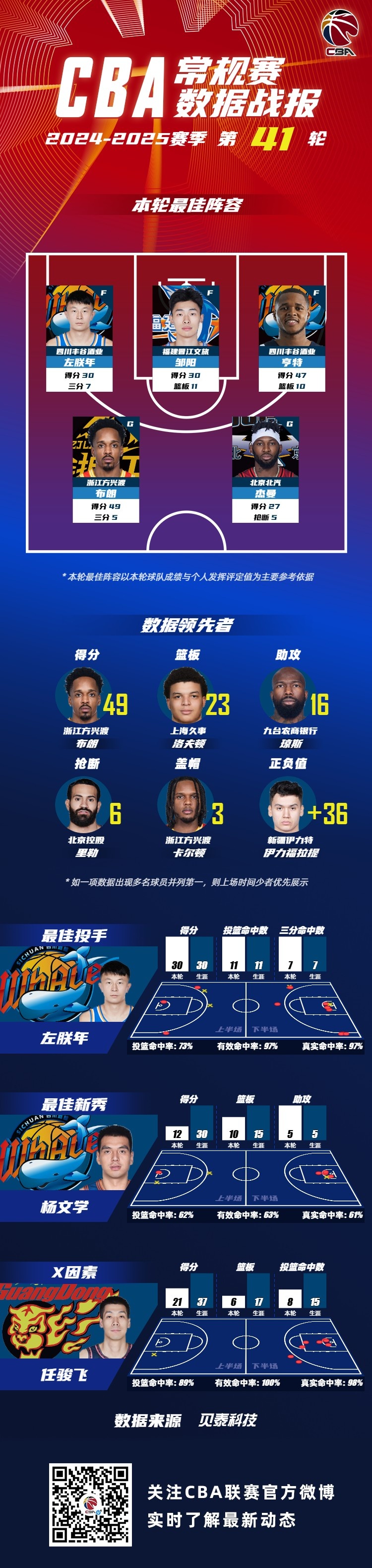 2024-2025賽季CBA聯賽常規賽第41輪結束較量,來自四川藍鯨的左朕年和亨特,福建潯興的鄒陽,浙江廣廈的布朗,北京首鋼的杰曼入選CBA聯賽常規賽第41輪最佳陣容!