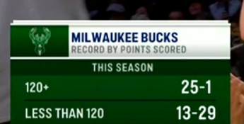 2025-03-21 16:49:10本賽季雄鹿得分120+的比賽25勝1負 得分少于120分的比賽13勝29負
