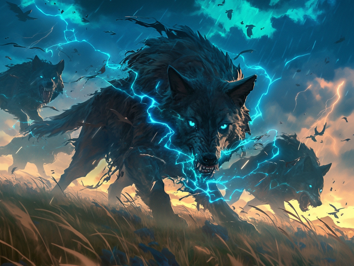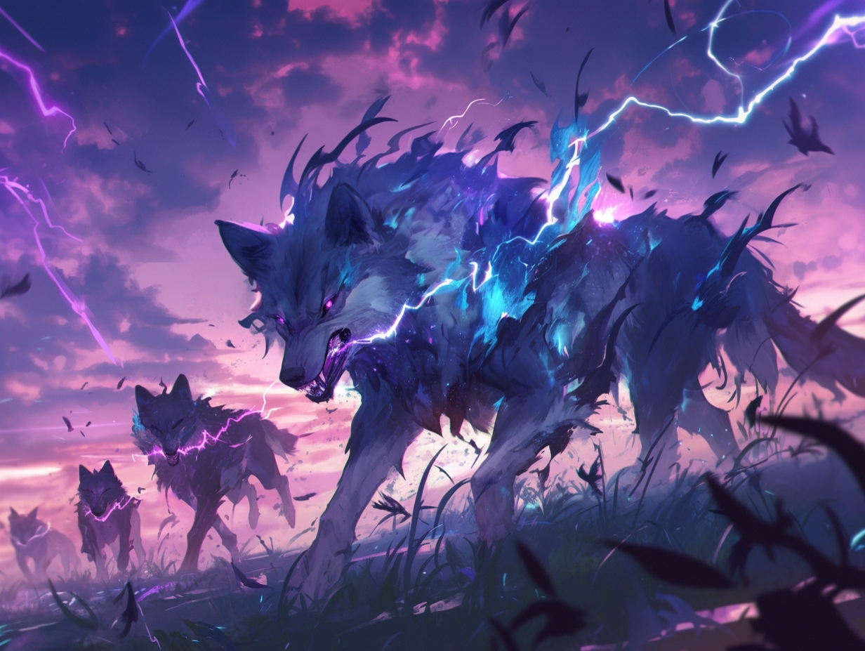 2025-02-25 15:12:12【AI繪圖】撕裂蒼穹!狼群化身雷電主宰~