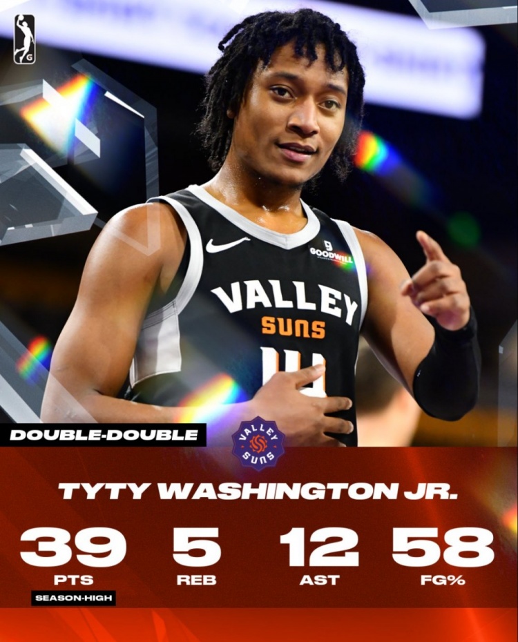 此役,前火箭球員小泰泰-華盛頓(效力于山谷太陽、太陽下屬G聯盟球隊)出戰36分7秒,投籃26中15,三分9中4,罰球4中3,爆砍39分5籃板12助攻2搶斷。