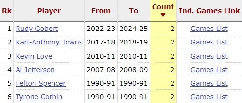 2025-03-31 20:29:04戈貝爾今天25板&10前場板 森林狼生涯第3次前場板上雙 隊史最多