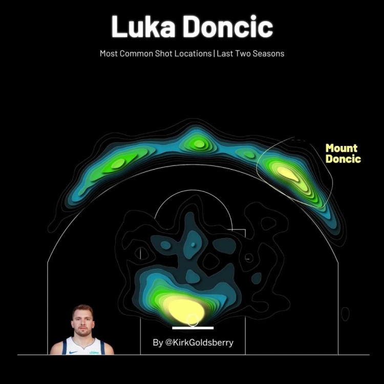 當你繪制出東契奇最常見的投籃位置時,有兩個熱點:一個在籃筐附近,另一個是在三分線外左側45度處。這個外線熱點正是東契奇在周日的比賽中讓布勞恩上當的地方——這也是東契奇最喜歡的起舞的位置。