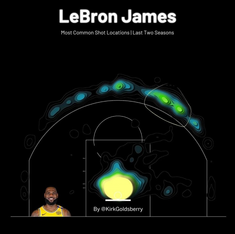 這與卡爾-馬龍和約翰-斯托克頓的情況不同。詹姆斯和東契奇都喜歡球場上的相同位置,兩人都偏愛三分線外左側45度以及突破至籃下。