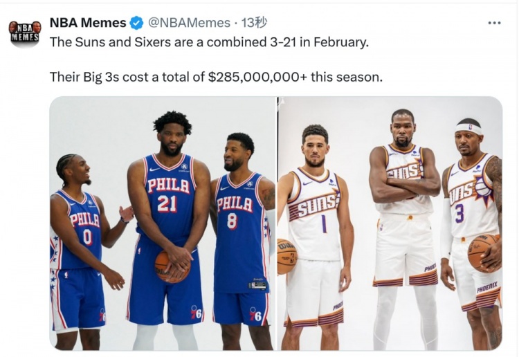 2025-02-28 15:18:19難兄難弟!美媒:太陽&76人2月共3勝21負 兩邊三巨頭工資2.85億+