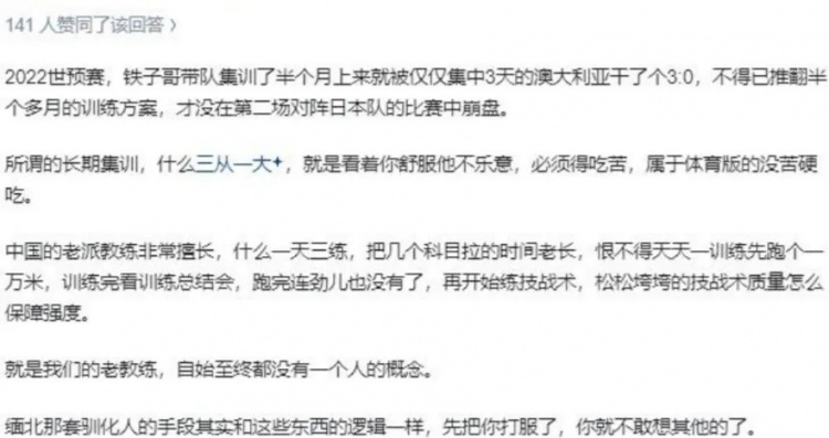 所以,問題不在集訓本身,而在于現在大環境改變下傳統意義上長期集訓表現出的不適應性。集訓本身在這一過程中有什么錯呢?而且宮魯鳴的話“只有長期集訓才能提升默契貫徹戰術。”這一“只有...才...”的句式起碼是基于過去的實踐經驗得出的結論;而在這一問題下的討論里,我們能看到大量“只要…就…”般的許愿。