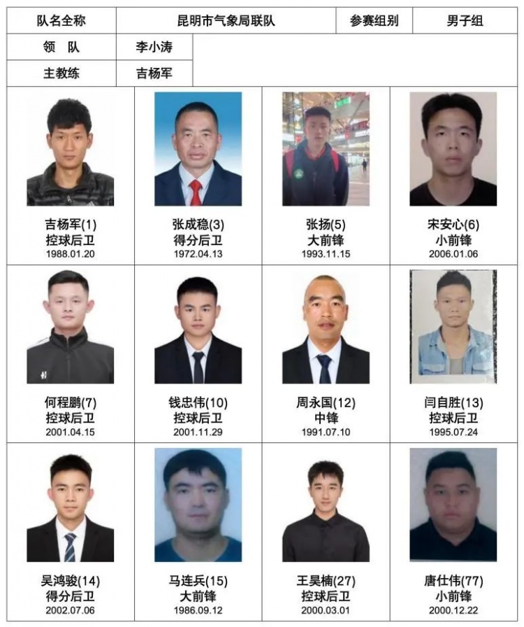 昆明市氣象局聯隊成立于2004年,主要由昆明市氣象局聯合各大企事業單位籃球愛好者組成。球隊注重團隊合作和個人技術的提高,定期組織訓練,始終秉承“快樂籃球、青春永駐”的宗旨進行鍛煉及比賽。球隊敢于挑戰、勇于創新,無論面對何種困難,都能夠緊密協作、克服困難、奮力拼搏?,技術風格上靈活多變。通過積極的參加訓練和比賽,享受籃球帶來的快樂。