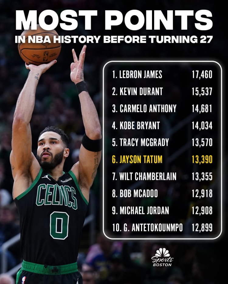 2025-03-01 21:23:28塔圖姆27歲前總得分超越張伯倫 暫列歷史第六&詹杜瓜高居前三