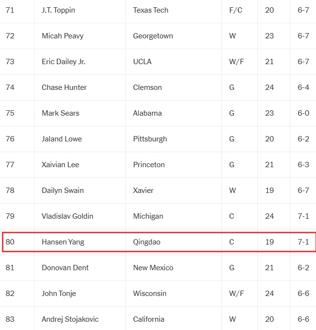 2025-03-01 21:25:17楊瀚森排名第80位!TA最新2025年選秀大板:弗拉格穩居榜首