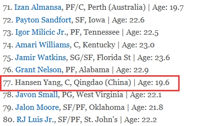 來自CBA青島男籃的楊瀚森排名第77,呈現緩慢上升的趨勢(前兩次ESPN的榜單中,楊瀚森排在第80和第90)。