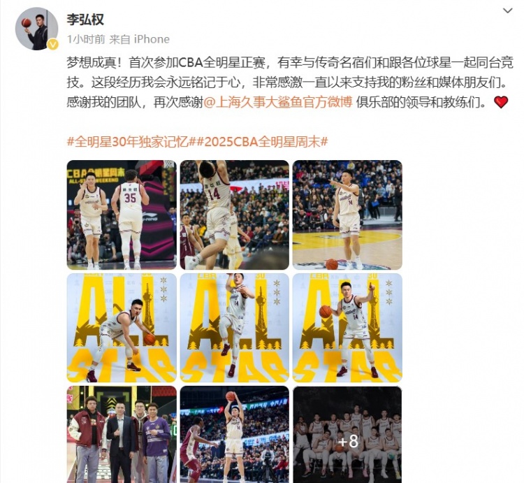 李弘權(quán)配文:“夢(mèng)想成真!首次參加CBA全明星正賽,有幸與傳奇名宿們和跟各位球星一起同臺(tái)競(jìng)技。這段經(jīng)歷我會(huì)永遠(yuǎn)銘記于心,非常感激一直以來(lái)支持我的粉絲和媒體朋友們。感謝我的團(tuán)隊(duì),再次感謝上海久事大鯊魚(yú)俱樂(lè)部的領(lǐng)導(dǎo)和教練們。”