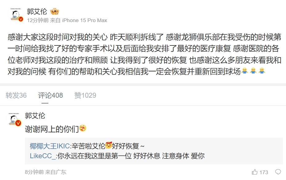 2025-03-05 15:51:29郭艾倫更博報平安:順利拆線了 我一定會恢復(fù)并回到球場!