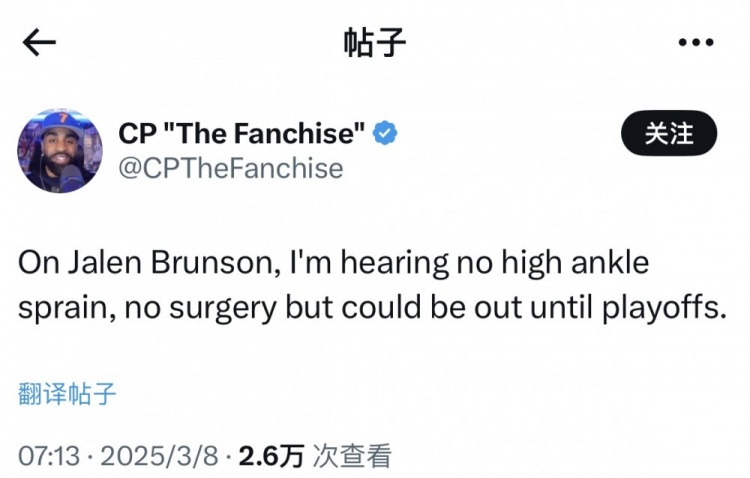 2025-03-08 18:12:29尼克斯博主:我聽說布倫森無需接受手術 但可能要缺席至季后賽前