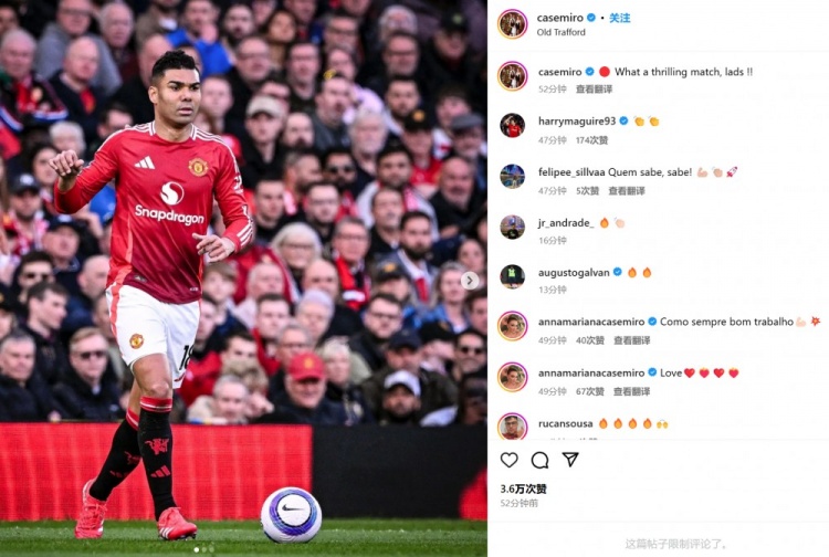 卡塞米羅也在賽后通過(guò)社媒曬出自己的比賽照,并感嘆:“小伙子們,多么激動(dòng)人心的一場(chǎng)比賽!”馬奎爾也現(xiàn)身評(píng)論區(qū)并留下代表鼓勵(lì)的鼓掌表情????????。