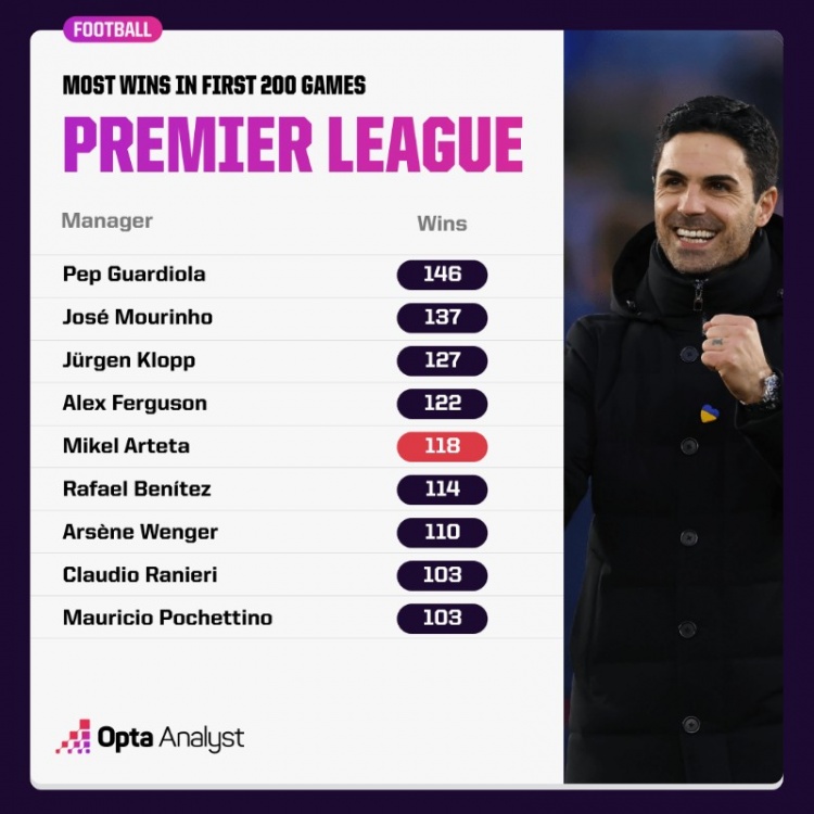 3月10日訊 阿森納在本輪英超焦點(diǎn)戰(zhàn)客場(chǎng)1-1戰(zhàn)平曼聯(lián),阿爾特塔在個(gè)人執(zhí)教英超200場(chǎng)里程碑未能獲得勝利。不過(guò)數(shù)據(jù)統(tǒng)計(jì)顯示,他仍然是英超歷史200場(chǎng)勝率第5高的主教練。