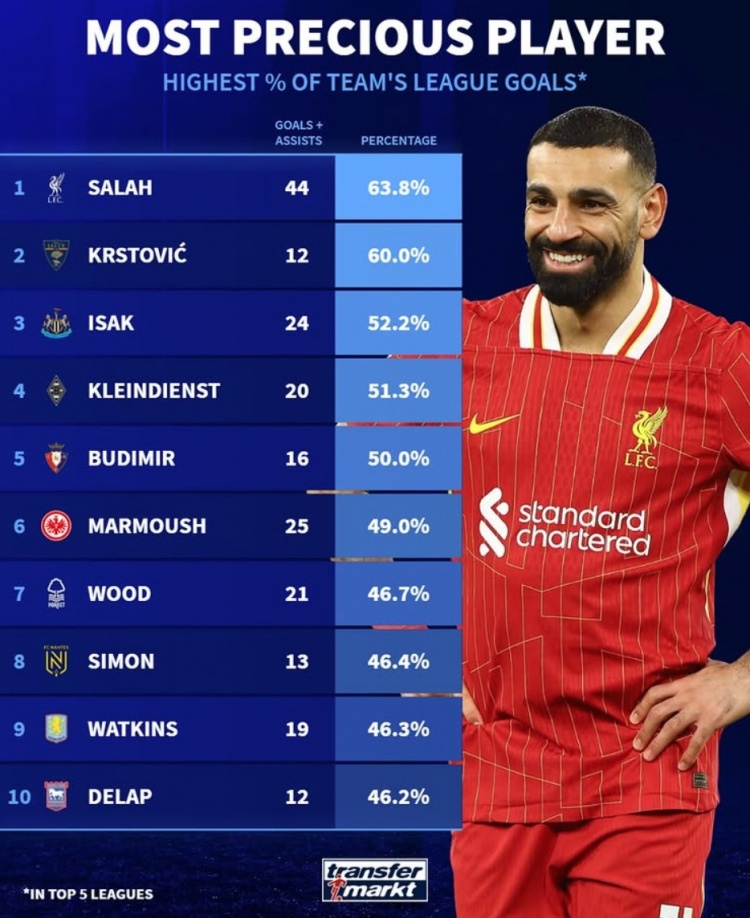 2025-03-11 11:33:39本賽季參與全隊進球比率:薩拉赫63.8%居首,伊薩克&馬爾穆什在列