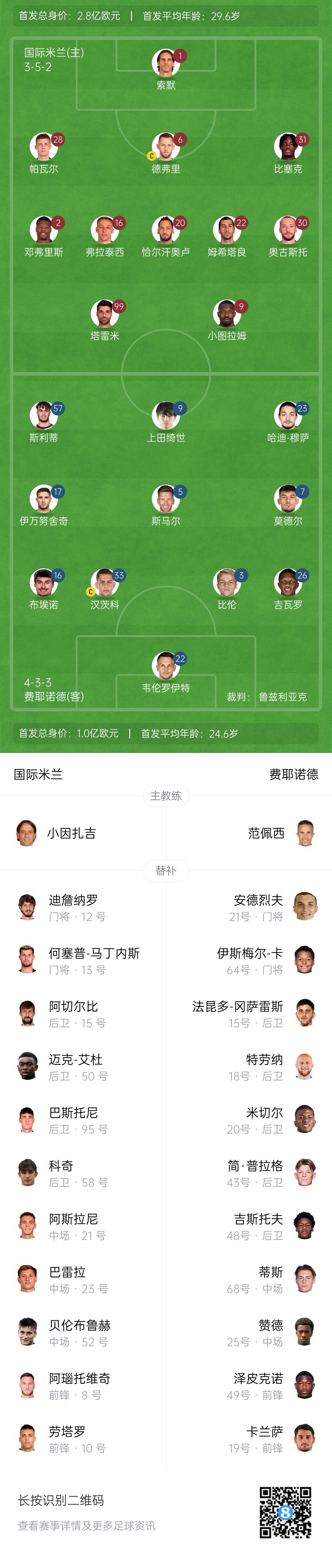 3月12日訊 歐冠16強次回合,國米主場迎戰費耶諾德比賽即將打響。賽前首發出爐。