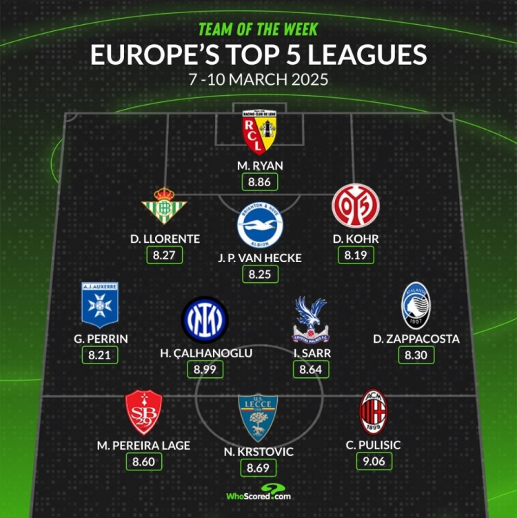 2025-03-12 04:13:04whoscored本周五大聯(lián)賽最佳陣:普利西奇&恰20領(lǐng)銜,袋鼠國(guó)門在列