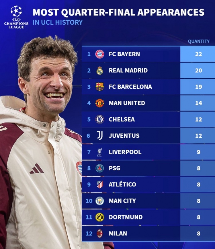 2025-03-12 04:14:26改制后歐冠共12支球隊至少8次晉級八強:仁皇薩前3,魔車文進前6