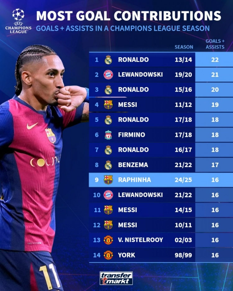 3月12日訊 本賽季拉菲尼亞在歐冠已經有11球5助攻,直接參與16球。德轉也盤點了歐冠歷史單賽季參與進球榜,其中C羅22球居首,具體如下(進球+助攻):