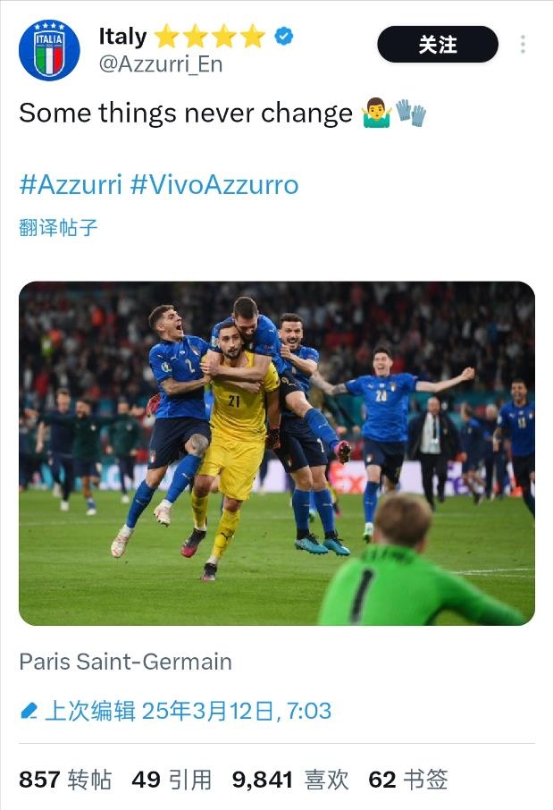 2025-03-13 06:08:43揭傷疤!意大利官推曬多納魯馬歐洲杯決勝瞬間:有些事永不會改變