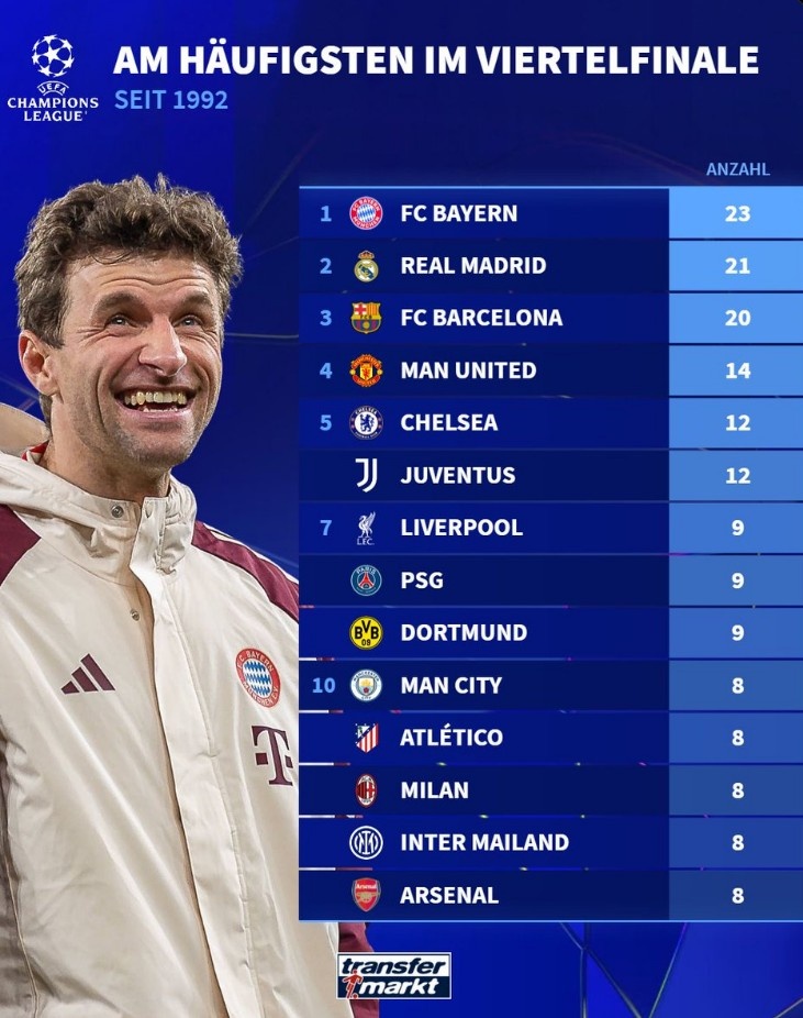 2025-03-13 17:19:36歐冠改制以來進(jìn)入8強(qiáng)次數(shù)榜:拜仁23次居首,皇馬次席,巴薩第三
