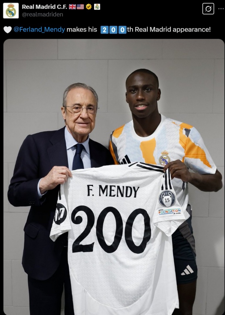 2025-03-13 17:31:21門迪達成皇馬200次出場里程碑,獲贈紀念球衣&與弗洛倫蒂諾合影