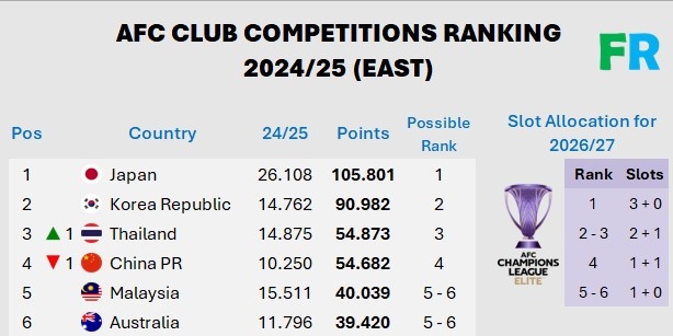 馬來超 40.039分 2026-27賽季亞冠精英聯賽名額1個