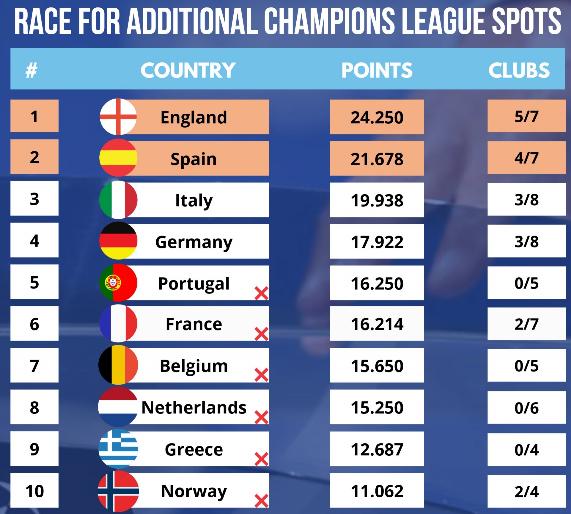 24/25賽季最新歐戰積分(前2名獲額外歐冠名額):