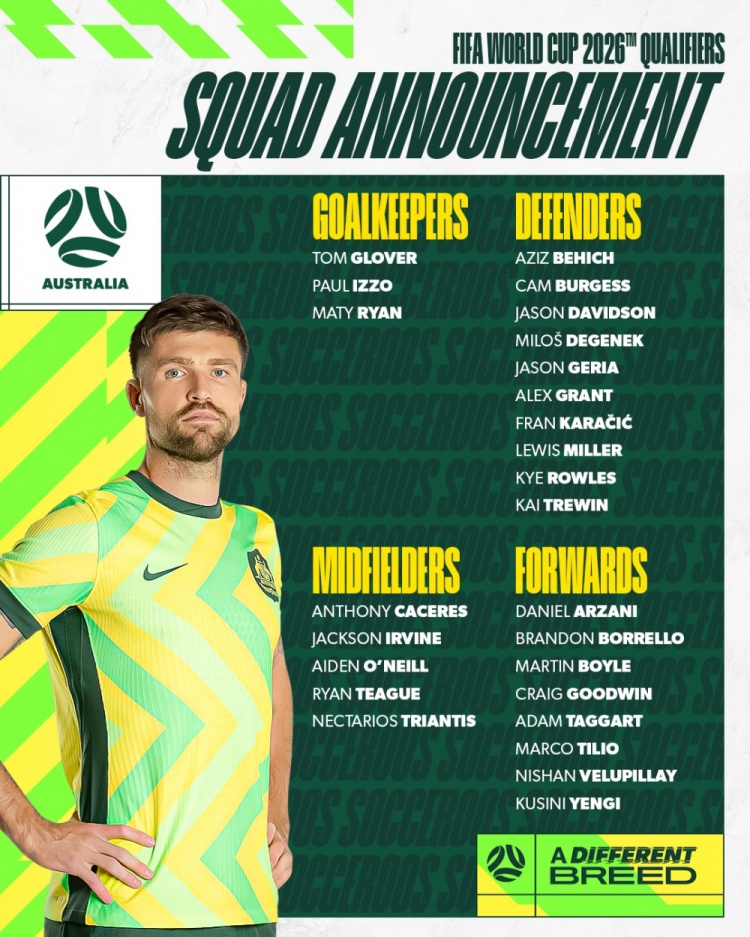 2025-03-14 12:00:11澳大利亞隊世預賽名單:“人民球王”古德溫領銜,3月25號對國足