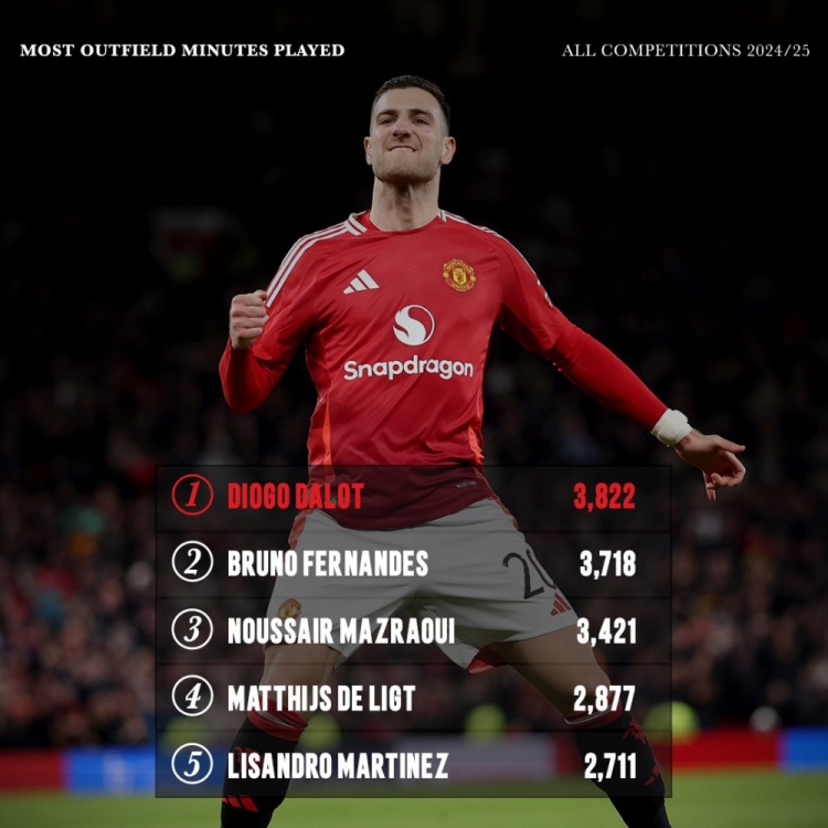 2025-03-16 09:41:21本賽季曼聯非門將出場時間榜:達洛特壓B費居首,馬茲拉維在列