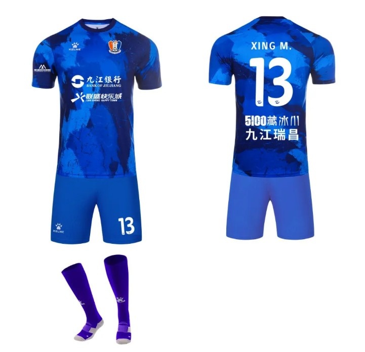 第一客場戰袍采用沉穩大氣的深藍色,彰顯球隊沉穩冷靜、從容不迫的氣質。以浩瀚星空為靈感,將深邃的藍色作為主色調,象征著江西廬山足球俱樂部胸懷遠大理想,在綠茵場上追逐夢想,永不言棄的精神。