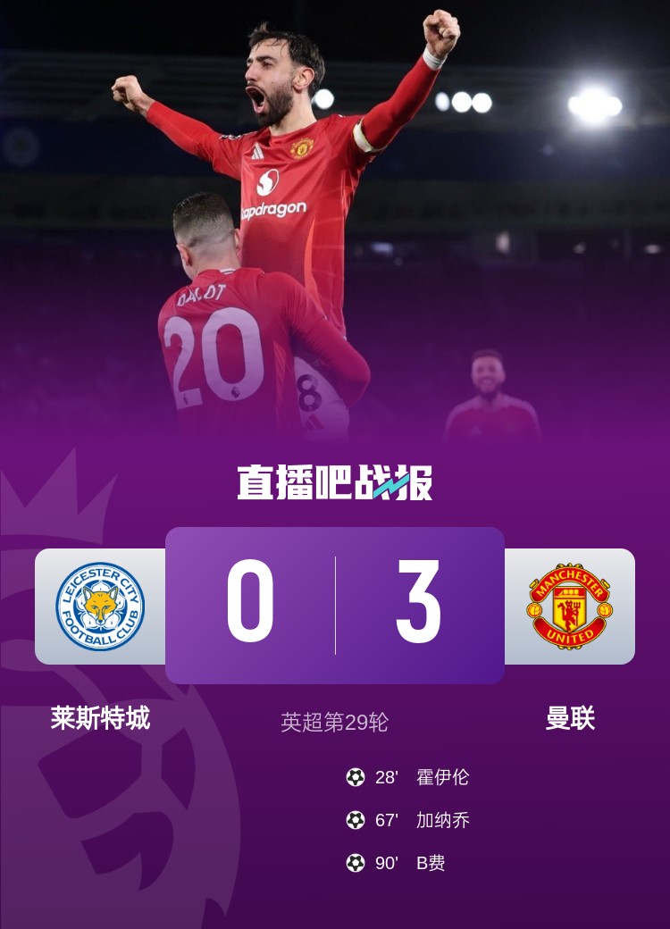 2025-03-17 03:49:562025年03月17日 賽季4殺!曼聯(lián)3-0萊斯特 B費(fèi)1射2傳霍伊倫加納喬破門海文傷退