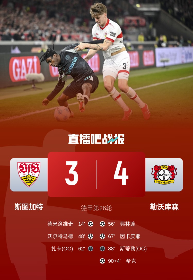 希克補(bǔ)時(shí)頭球絕殺,勒沃庫(kù)森4-3逆轉(zhuǎn)斯圖加特。積分榜方面,勒沃庫(kù)森落后拜仁6分。