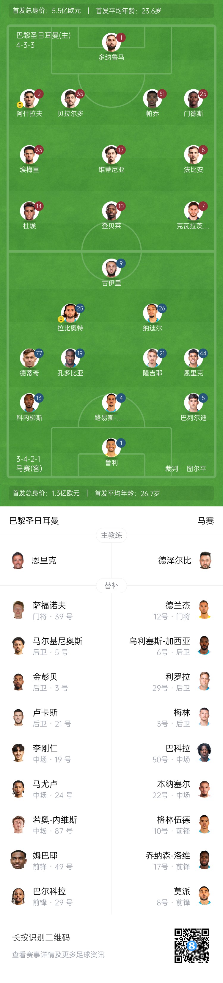 巴黎首發(fā):1-多納魯馬、2-阿什拉夫、35-貝拉爾多、51-帕喬、25-努諾-門德斯、8-法比安、17-維蒂尼亞、33-扎伊爾-埃梅里、7-克瓦拉茨赫利亞、10-登貝萊、14-杜埃