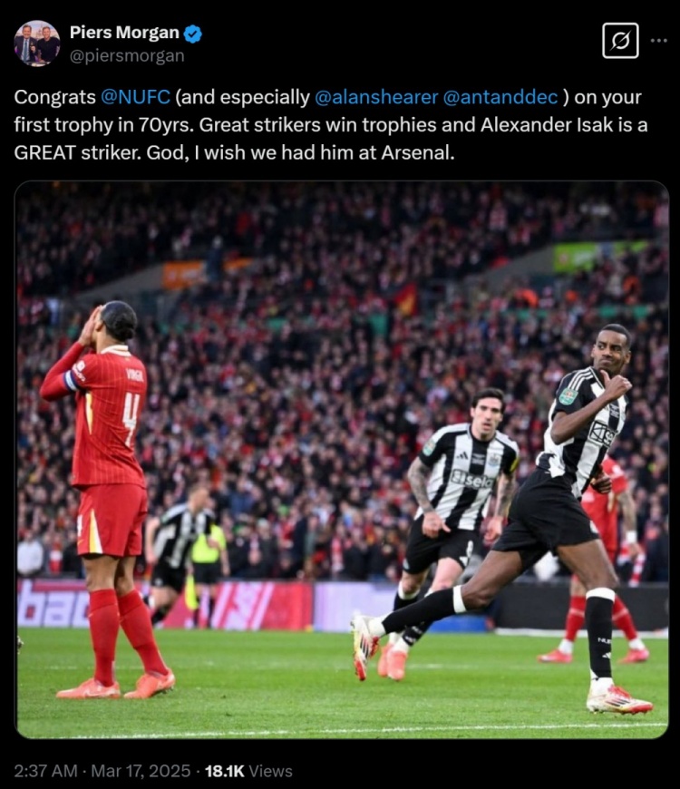 2025-03-17 11:27:32摩根:祝賀紐卡時隔70年奪冠 有好前鋒能奪冠&希望槍手能簽伊薩克