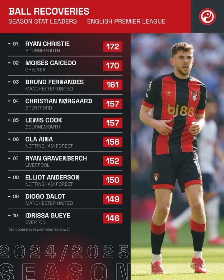 2025-03-18 07:03:51本賽季英超贏得球權榜:凱塞多170次第二,B費、赫拉芬貝赫在列