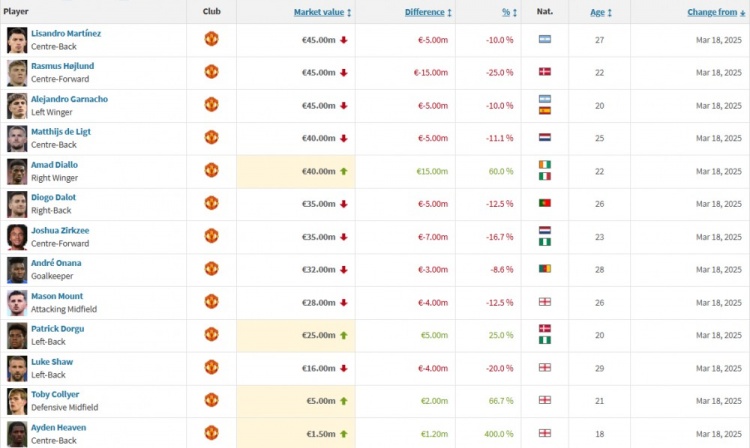 3月18日訊 德轉更新了部分英超球員身價,在此次更新中有13位曼聯球員身價發生了變化,其中9人出現下跌,4人出現上漲。