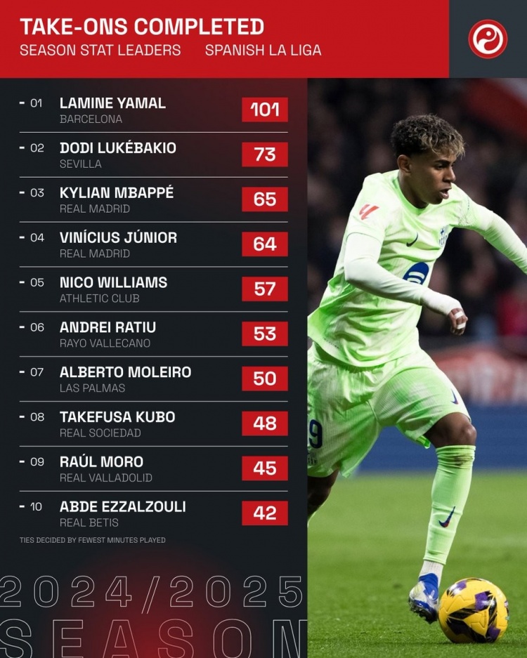 2025-03-19 03:40:38本賽季西甲成功過人榜:亞馬爾斷崖領跑,姆巴佩、維尼修斯在列
