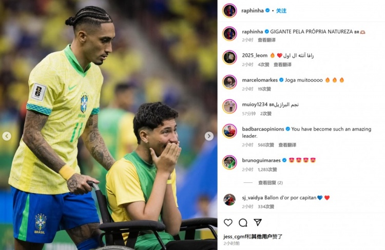 2025-03-22 11:07:12傳射建功!拉菲尼亞曬與殘疾球迷合照:他們在心靈層面是巨人