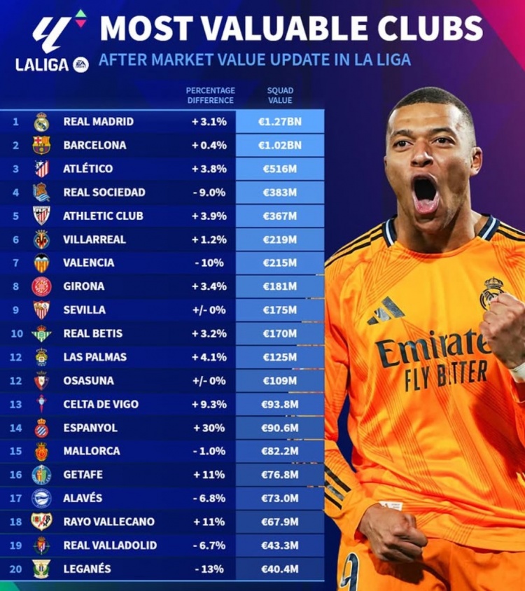 2025-03-22 11:07:57德轉更新西甲球隊身價榜:皇馬12.7億、巴薩10.2億、馬競5.16億