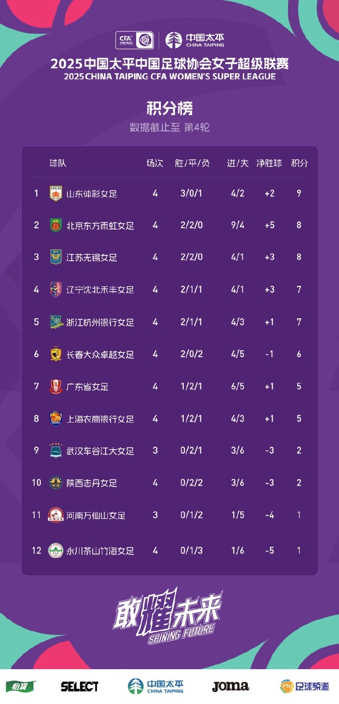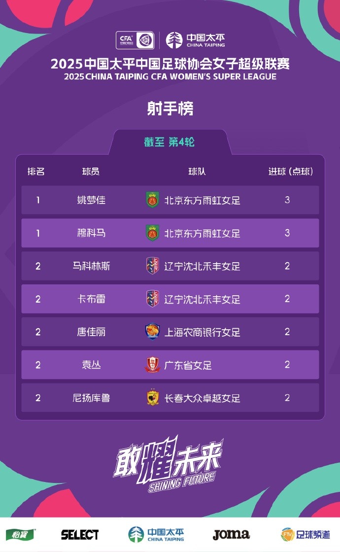 2025-03-23 20:20:01女超聯(lián)賽第4輪積分榜&射手榜