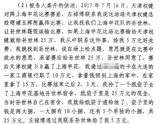被告人秦升的供述:2017年1月16日,天津權(quán)健對(duì)陣上海申花比賽賽前,左祿博聯(lián)系我說(shuō)這場(chǎng)球天津權(quán)健總經(jīng)理褚玉輝想贏得比賽,讓我找我們上海申花隊(duì)的孫世林,讓孫世林踢假球輸比賽,如果上海申花這場(chǎng)比賽輸給天津權(quán)健就給孫世林25萬(wàn),我從中聯(lián)系這件事,給我5萬(wàn)元好處費(fèi),我就找到孫世林,說(shuō)在場(chǎng)上松點(diǎn)踢,意思就是在比賽中放水的意思,承諾賽后給孫世林25萬(wàn),孫世林同意了,賽后天津權(quán)健3:0贏了上海申花,我通過(guò)的XXX卡在大連的一家工商銀行取了10萬(wàn)元,拿著錢(qián)回到上海的家中,在家里拿了15萬(wàn),比賽結(jié)束之后2、3天,我拎了一個(gè)紙袋子去了上海申花基地孫世林宿舍,紙袋子里是25萬(wàn)元的現(xiàn)金,當(dāng)時(shí)孫世林自己在宿舍,我就給紙袋子遞給他了。袋子里的錢(qián)是兩大捆,一大捆有10小捆,還有5個(gè)單獨(dú)的小捆,共25萬(wàn)元。左祿博通過(guò)我聯(lián)系孫世林給了我5萬(wàn)元。
