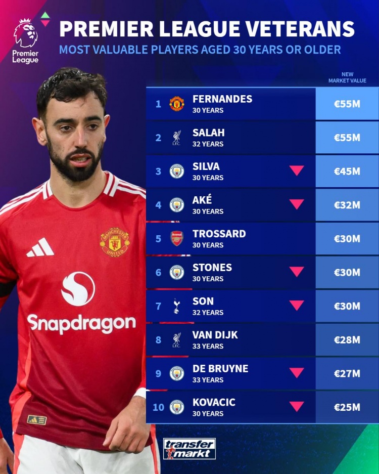 2025-03-23 20:27:14英超年齡30+球員身價榜:B費、薩拉赫5500萬歐居首,B席第三