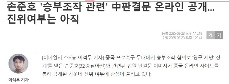 2025-03-23 20:30:18韓媒關注孫準浩證詞:此前球員否認現在承認 判決真實性尚不清楚