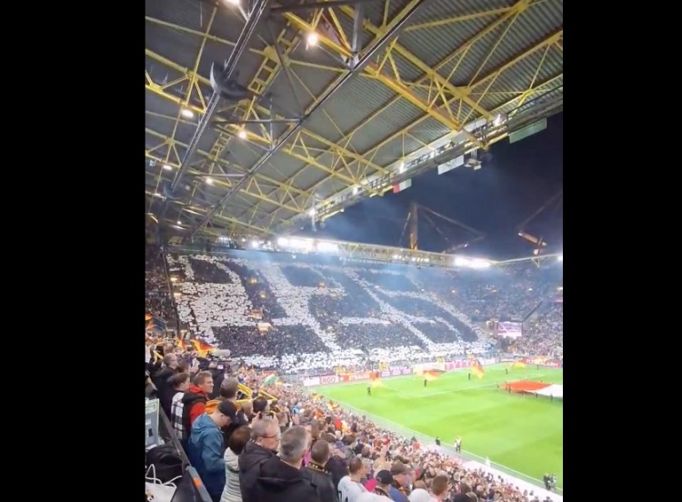 3月24日訊 德國在歐國聯八強戰次回合再戰意大利,賽前多特蒙德的主場球迷們打出了巨型TIFO致敬德國足協成立125周年。